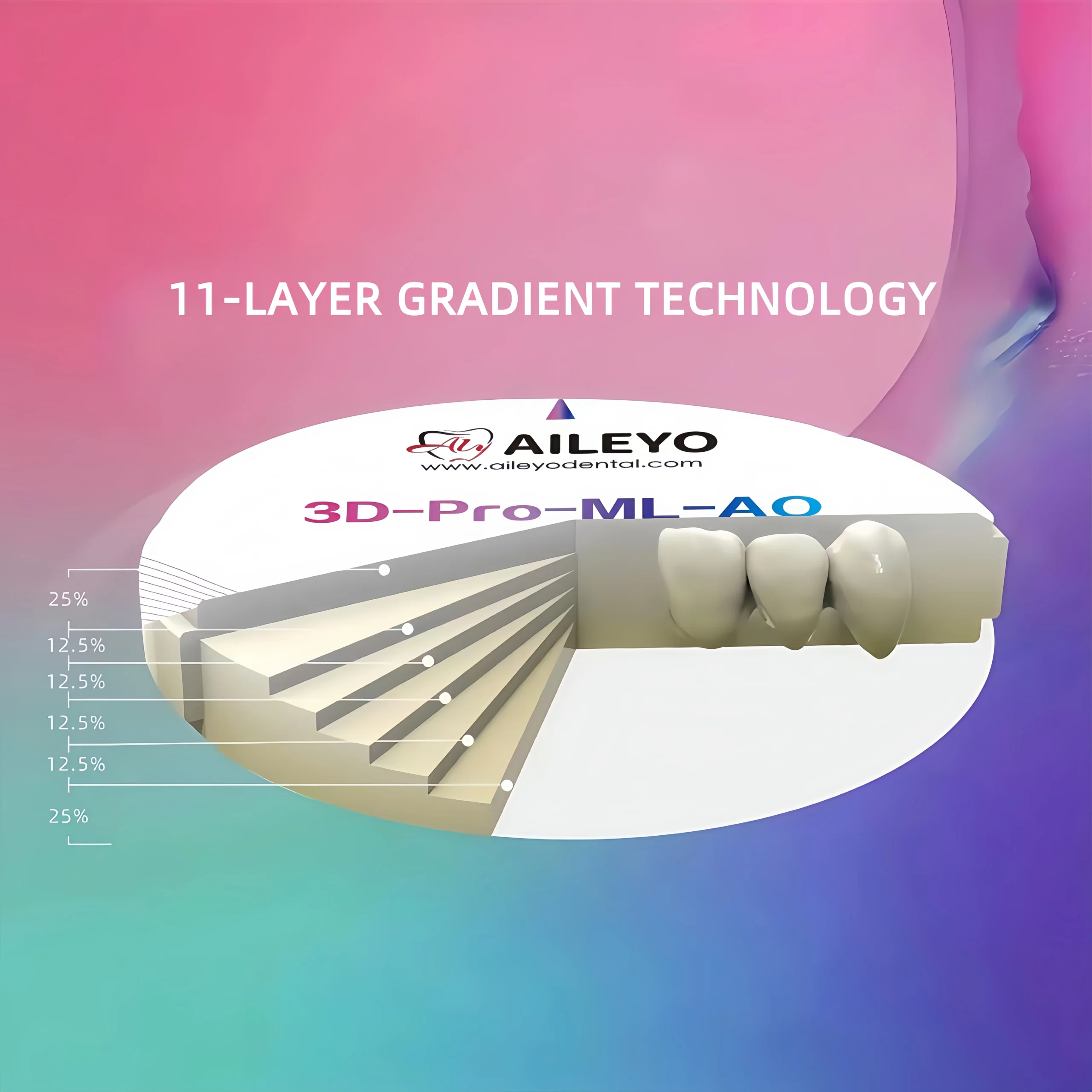3D-Pro-ML-AO is an innovative multilayer zirconia block engineered with 11 seamless gradient layers, delivering exceptional esthetics and reliable strength — perfectly mimicking the natural tooth structure from gingival to incisal.